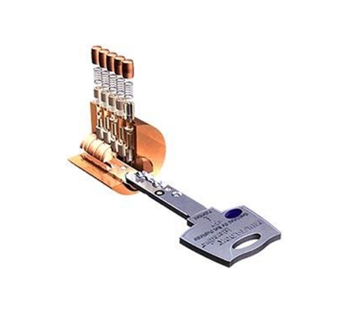 当锁身的弹子孔与锁芯的弹子孔完全重合时,锁身弹子孔内的弹簧发挥弹力作用,把锁身弹子孔内的弹子向上顶出。锁身弹子孔内的弹子被顶进了锁芯弹子孔内。锁芯弹子孔内原有的弹子在同一时间被向上顶。由于锁芯钥匙孔内有一条长凸条卡住,阻挡锁芯弹子孔内的弹子,使弹子不被顶出弹子孔口外,脱掉出来。厂家生产锁时,都计算过弹子的长度和锁芯弹子孔的深度。一般都必须是锁身弹子孔内和锁芯弹子孔内的两粒弹子长度之和大于锁芯弹子孔深度加锁芯弹子孔口到长凸条的长度。且锁芯弹子孔内的弹子长度必须大于锁芯弹子孔口到长凸条的长度的1/3以上。这样,锁芯弹子孔内的弹子孔口有长凸条卡住而不被顶脱出弹子孔,那锁身弹子孔的弹子在弹簧作用下就有部分长度顶进了锁芯弹子孔内。锁身弹子孔内的弹子卡进了锁芯弹子孔内的同时,也就是把锁芯卡住,等于是卡住了圆形的物体,使圆形物体无法随意转动。此时,锁是处于锁着状态,就是平常说的“上锁了”。然而,在伸钥匙进入锁芯钥匙孔后,钥匙上的齿槽把锁芯弹子也内的弹子向下压缩,刚好把锁芯弹子孔内的弹子全压倒,压平锁芯弹子孔的另一面孔口处,(锁芯弹子孔口与锁身弹子孔口的接触面),这时锁身弹子孔内的所有弹子由于被锁芯弹子孔内弹子向下压的作用,也全部被压平锁身弹子孔口,回到锁身弹子孔内。这时,锁身弹子孔内的弹子不能卡进锁芯弹子孔内,锁芯弹子孔内被下压的弹子也不能压下进入锁身的弹子孔内,就是说没有了东西卡住圆形锁芯。然后可用钥匙扭转锁芯进行转动,锁芯转动后则带动锁身内的机关,把锁打开。这便是开锁原理。所以,只要是圆形锁芯的锁其开锁原理完全相同。